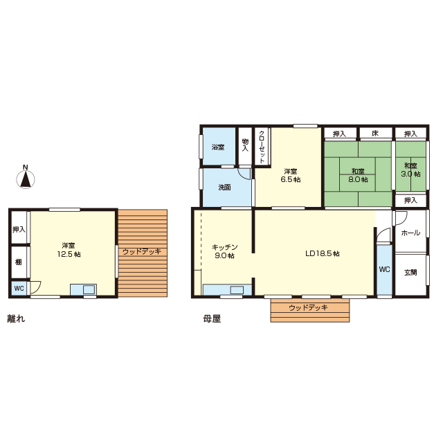 | 土地面積 | 732.90㎡(約221.70坪) | 建物面積 | 母屋:木造亜鉛メッキ銅板平家建100.82㎡(約30.49坪)、離れ:木造スレート瓦葺平屋建24.3㎡(約7.35坪) |